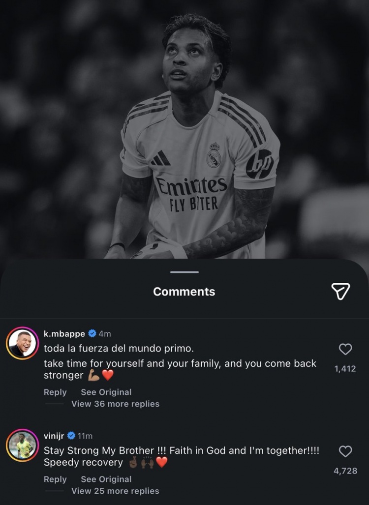 3月4日讯 皇马官方确认,队内前锋罗德里戈右膝十字韧带断裂,外侧半月板断裂,队友姆巴佩、维尼修斯社媒留言鼓励罗德里戈。